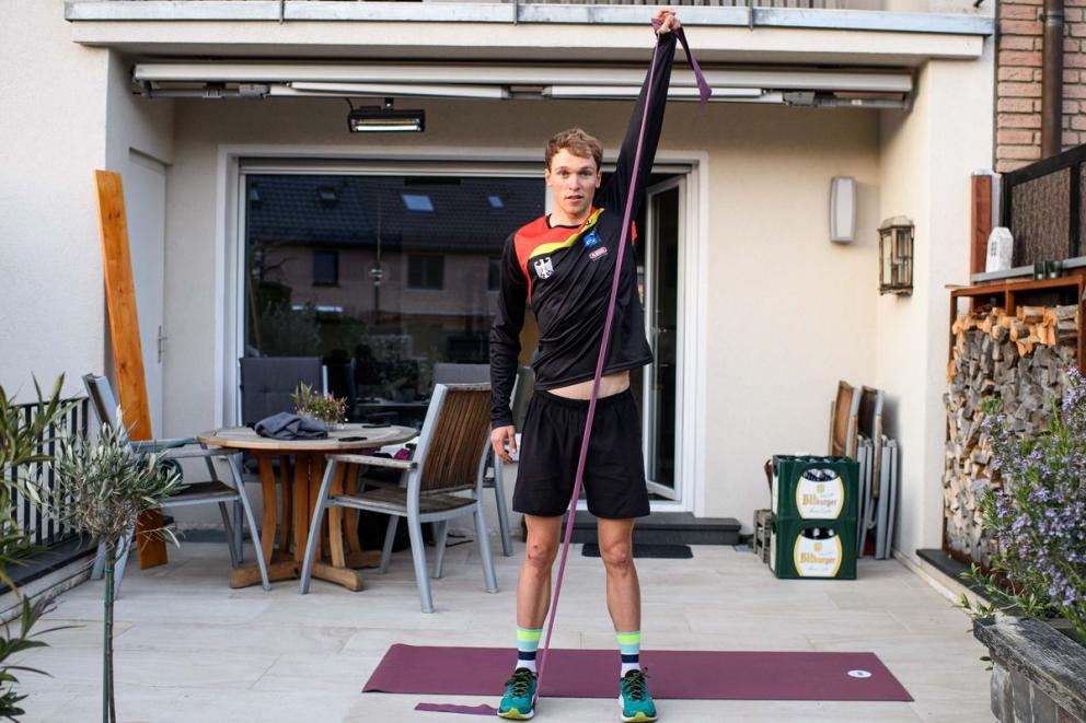 Diese Übung ist für Simon eine gute Ersatzübung für das derzeit nicht mögliche Schwimmtraining. Ihr nehmt dafür die Liegestütz-Grundposition ein. Der Körper bildet eine Linie, der Bauch ist angespannt. Ihr greift mit den Händen etwa schulterbreit und streckt die Arme durch. Dann zieht ihr abwechselnd die Schultern hoch und senkt sie wieder ab. „Das ist eine gute Übung, um die Stabilität im Wasser zu trainieren“, sagt Simon. Er wiederholt das Hochziehen und Absenken etwa 30 Mal und macht drei Durchgänge der Übung.