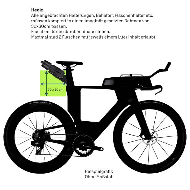 Begründung: Ausnahmen: - Die Befestigung mit Klebemitteln aller Art ist untersagt. - Scharfkantige Behälter/Befestigungen sind gem. SpO §23.3 nicht zugelassen. - Des Weiteren müssen alle Teile gem. SpO § 23.6 aus unzerbrechlichem Material sein. - Es gelten grundsätzlich die Regelungen für Flaschenhalter. - Bei Rennen mit Windschattenfreigabe gelten die Vorgaben nach § 31.6 - Werkzeugboxen (zur Aufbewahrung von Schläuchen, CO2-Kartuschen, Reifenhebern oder anderen Werkzeugen zur Reparatur) sind von dem imaginären 30 x 30 cm Rahmen ausgenommen. |