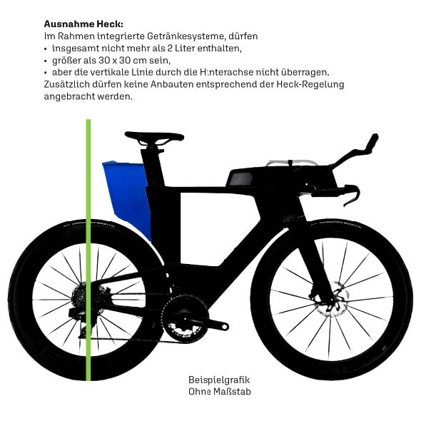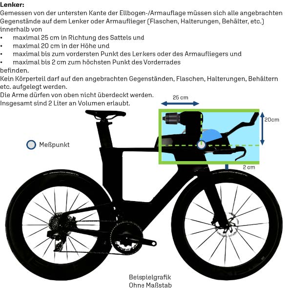 Begründung: Aero Trinksysteme die am Lenker bzw. dem Armauflieger verbaut werden sind zugelassen, sofern sie über eine geeignete Befestigung verfügen. Sie gelten nicht als Verkleidung. Ausnahmen: - Die Befestigung mit Klebemitteln aller Art ist untersagt. - Insgesamt darf der befestigte Trinkbehälter dabei nicht breiter sein als der Abstand der Armauflieger (Außenmaß) und die Arme von oben nicht überdecken. Die Arme überdecken bedeutet, dass diese in der Länge von Ellenbogen bis zur Hand jeweils nicht mehr als die Hälfte überdeckt werden dürfen. Die Nutzung einer Standardflasche zwischen und oberhalb der Arme ist somit grundsätzlich unkritisch. - Scharfkantige Behälter/Befestigungen sind gem. SpO §23.3 nicht zugelassen. - Des Weiteren müssen alle Teile gem. SpO § 23.6 aus unzerbrechlichem Material sein. - Das Volumen aller Behälter darf dabei ein Gesamtvolumen am Lenker oder Lenkervorbau von 2 Liter nicht übersteigen. - Die in der Grafik gezeigte Trennlinie regelt die Trennung zwischen Oberrohr und Lenker. Somit gelten für die Anteile eines Getränkebehälters der in Kombination mit einem Anteil auf dem Oberrohr steht, ab der Trennlinie die Regelungen für das Oberrohr. Zudem ist ein Gelenk vorgeschrieben. - Bei Rennen mit Windschattenfreigabe ist das Anbringen jeglicher Behälter am Lenker verboten. |