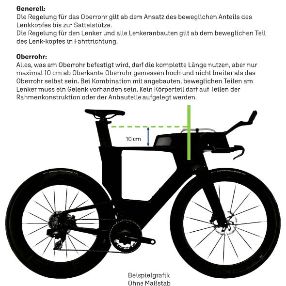 Begründung: Aero Verpflegungsboxen und Rahmentaschen die auf dem Oberrohr verbaut werden sind zugelassen, sofern sie über eine geeignete Befestigung verfügen und eine Höhe gemessen ab der Oberkante des Oberohres von 10cm nicht überschreiten. Ausnahmen: - Die Befestigung mit Klebemitteln aller Art ist untersagt. - Scharfkantige Behälter/Befestigungen sind gem. SpO §23.3 nicht zugelassen. - Des Weiteren müssen alle Teile gem. SpO § 23.6 aus unzerbrechlichem Material sein. - Aufbewahrungsboxen/-taschen dürfen nicht höher als 10cm gemessen von der Oberkante des Oberrohres sein. - Durchgängige Systeme in Kombination mit direkt auf dem Lenker aufgesetzten Teilen (z.B. Trinkbehälter) müssen ein Gelenk aufweisen. - Getränkebehälter auf dem Oberrohr sind gem. § 23.6 d. nicht zugelassen. - Die in der Grafik gezeigte Trennlinie regelt die Trennung zwischen Oberrohr und Lenker. Somit gelten für die Anteile eines Getränkebehälters der in Kombination mit einem Anteil auf dem Lenkersteht, ab der Trennlinie die Regelungen für den Lenker. Zudem ist ein Gelenk vorgeschrieben. |
